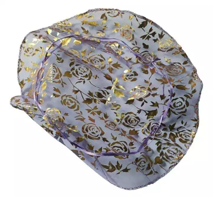 Linda embalagem redonda de tecido organza estampado com fita de cetim para puxar e fechar o saquinho.