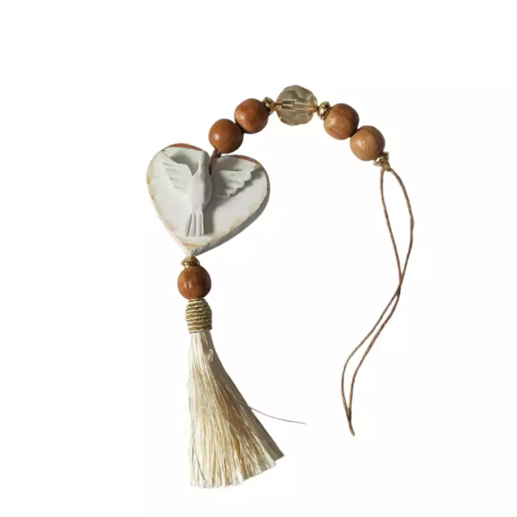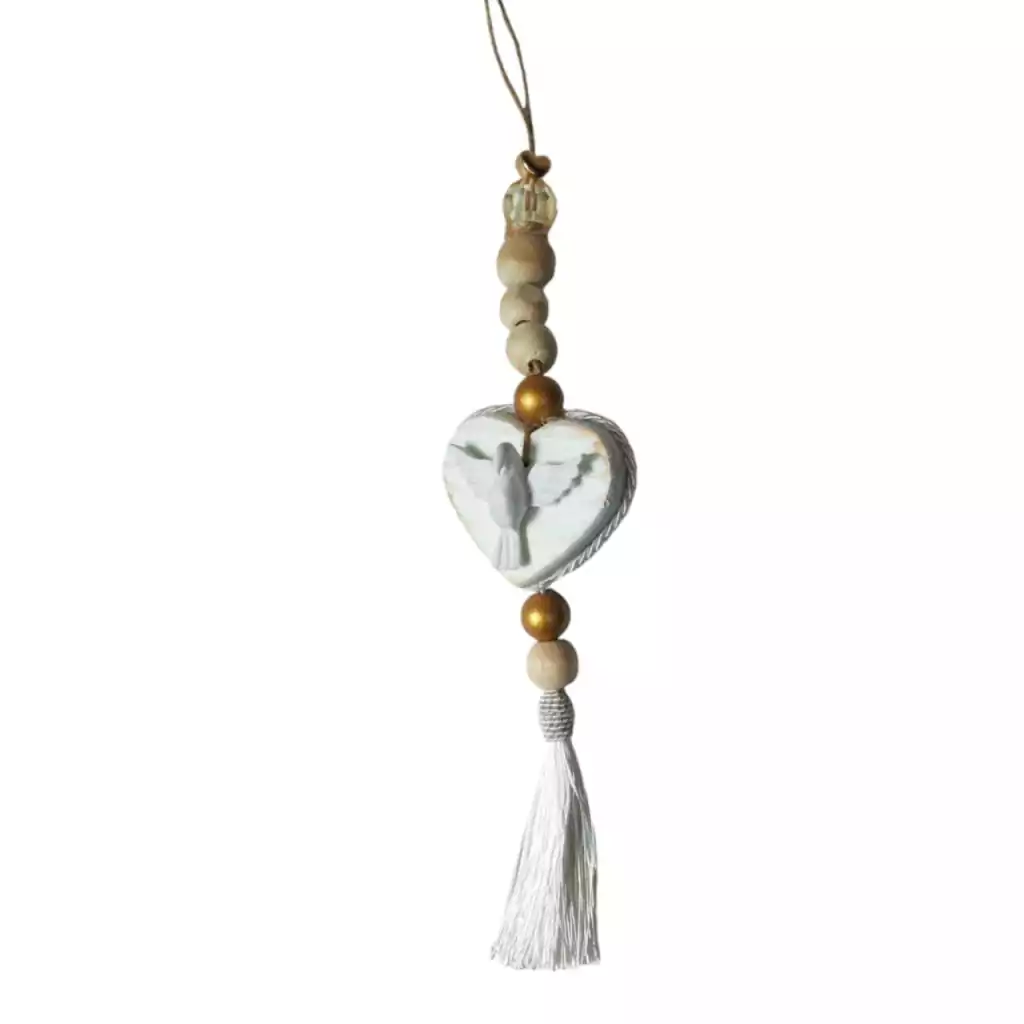 Lindo e sofisticado enfeite medalhão decorativo com coração de madeira, bolas de madeira, pingente tassel, pombo de resina, miçangas e cordão rami