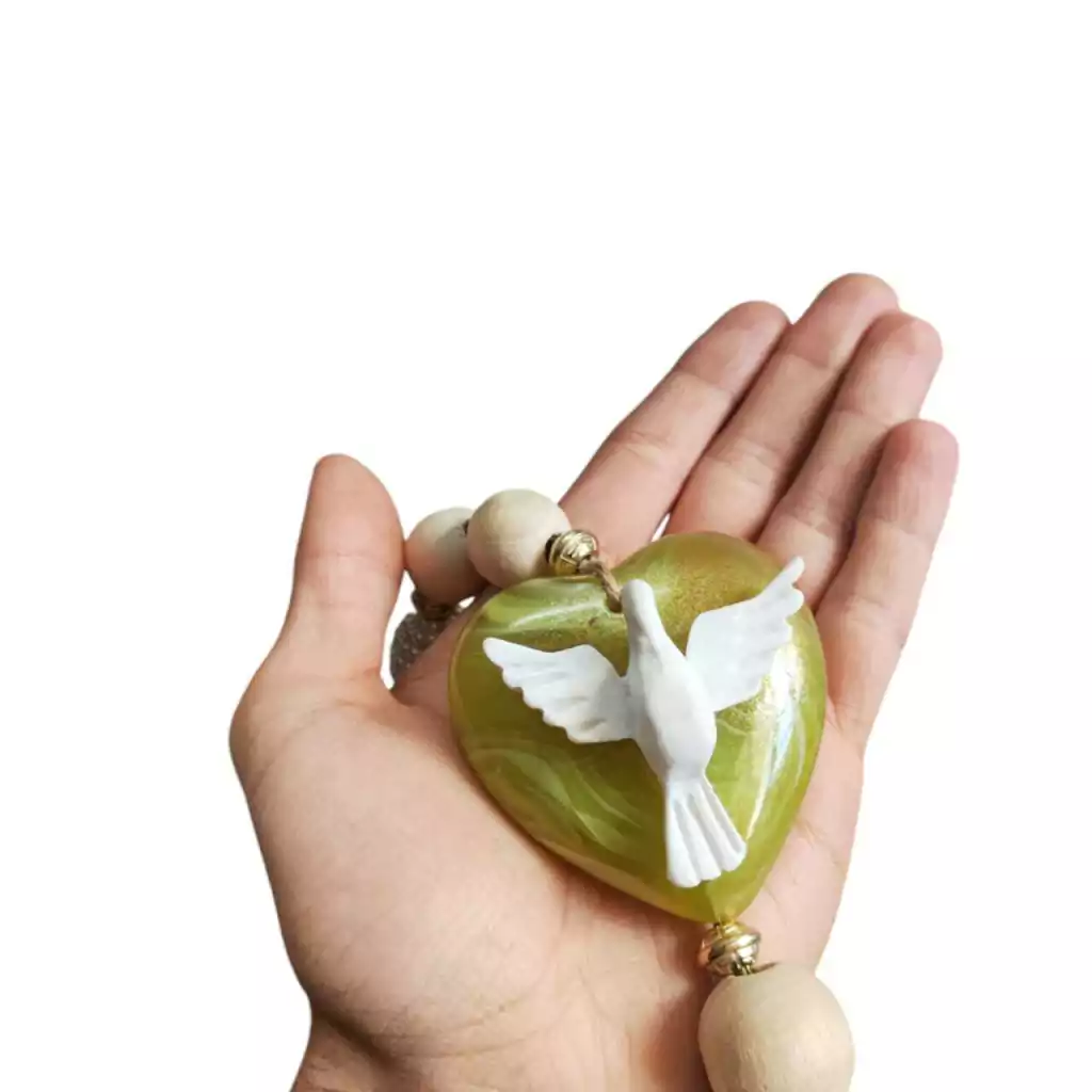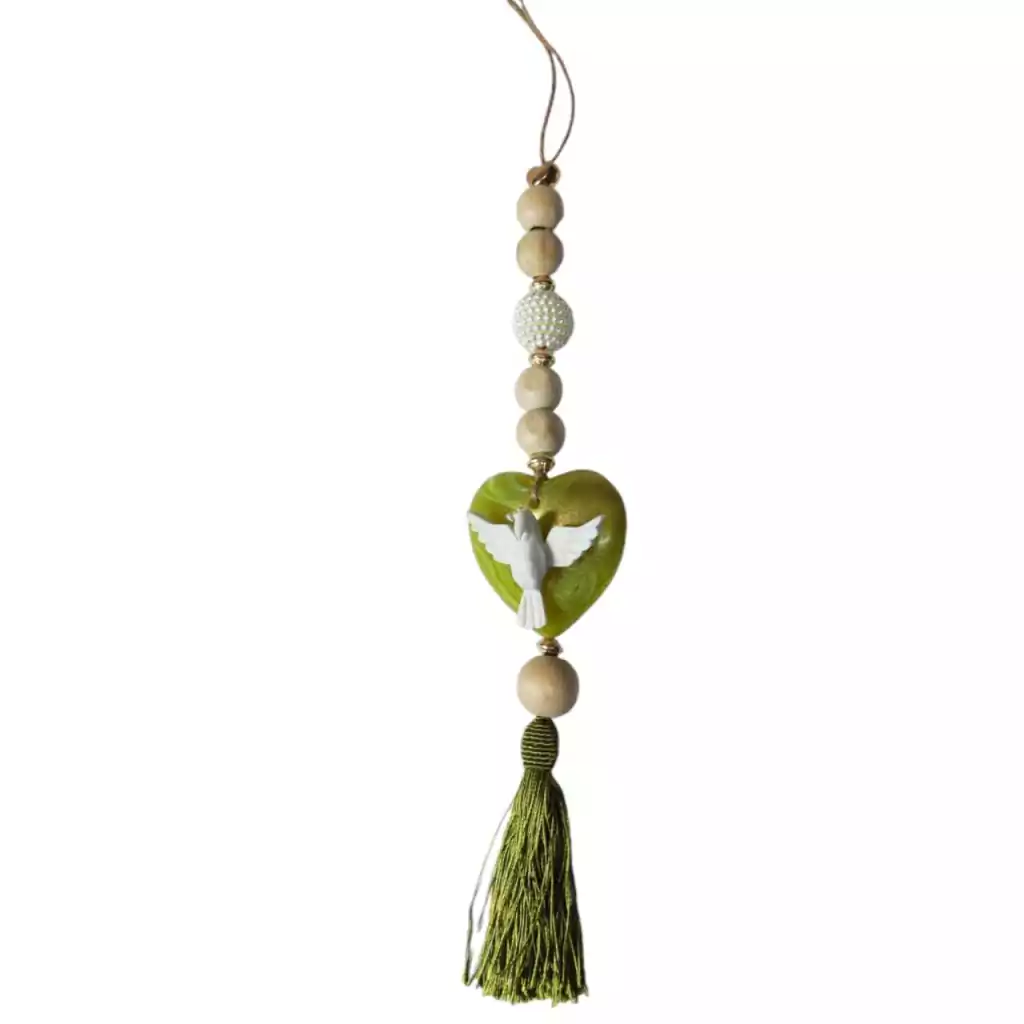Lindo e sofisticado enfeite medalhão decorativo com coração de resina, bolas de madeira, pingente tassel, pombo de resina, miçangas e cordão rami