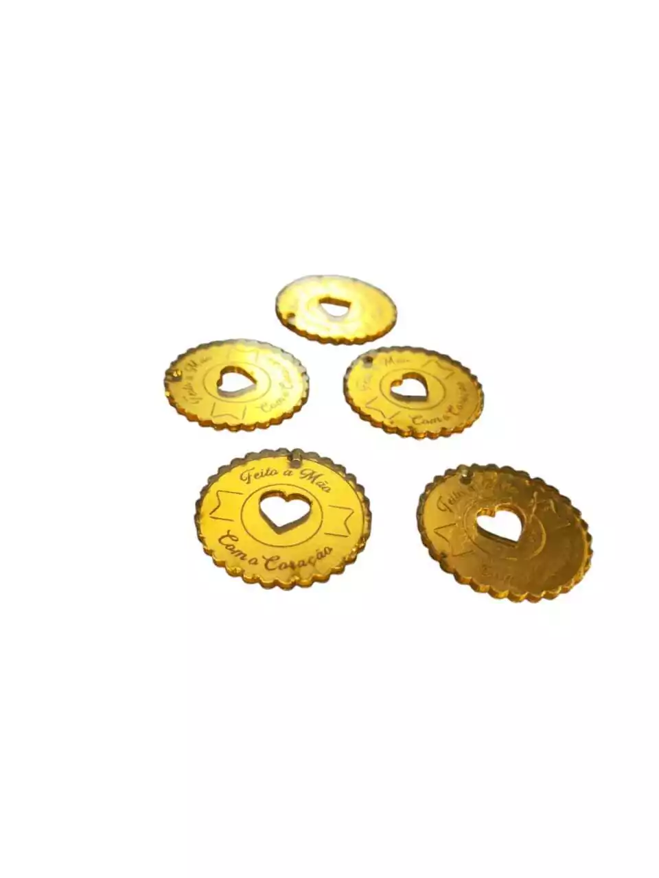 Tags plaquinhas etiquetas decorativas redonda trabalhada e coração em acrílico escrito FEITO A MÃO COM O CORAÇÃO