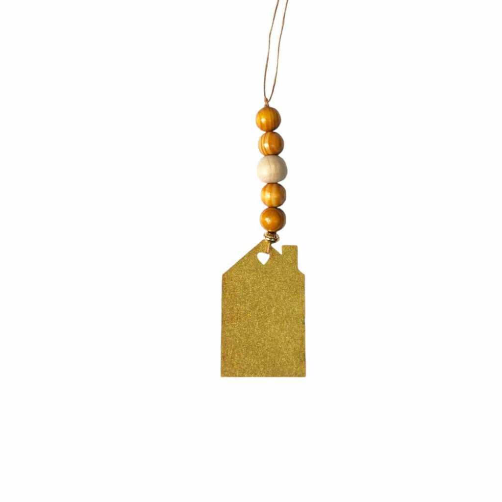 Lindo pingente decorativo com casinha de MDF dourada, bolas de madeira, cordão em rami e entremeios